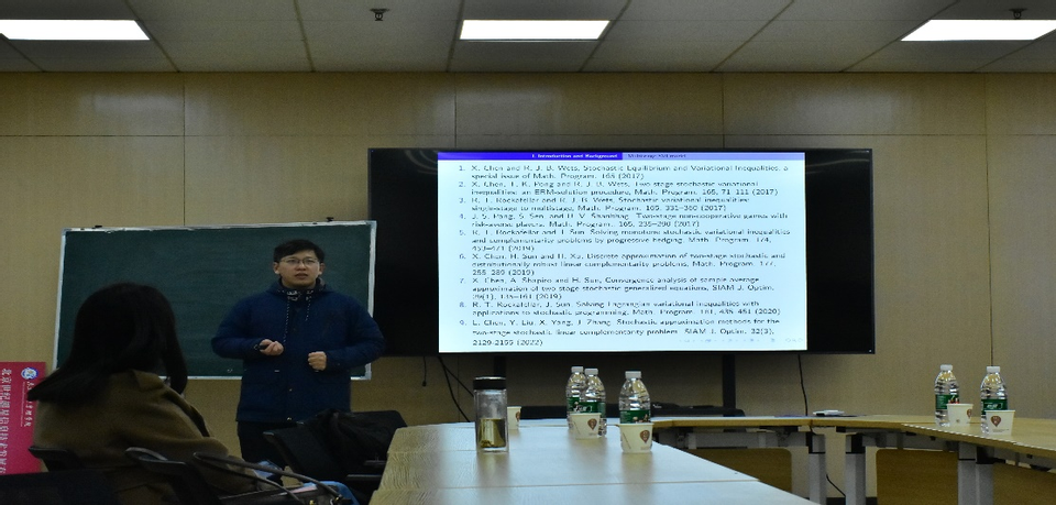 孙海琳教授为大家带来了题为“Dynamic Stochastic Projection Method for Multistage Stochastic Variational Inequalities”的学术报告。孙教授以经典的报童问题为例,详细解释了多阶段优化问题的实际应用背景,以及随机变分不等式在现代优化理论中的重要性。他深入探讨了这一领域的历史发展,从早期的理论探索到当前的研究前沿,为听众提供了一个全面的视角。借此,孙教授介绍了怎么样通过随机近似的方法来设计相关算法对多阶段随机变分不等式问题进行求解。这种方法通过随机近似技术,能够有效地处理多阶段随机问题中的不确定性和复杂性。