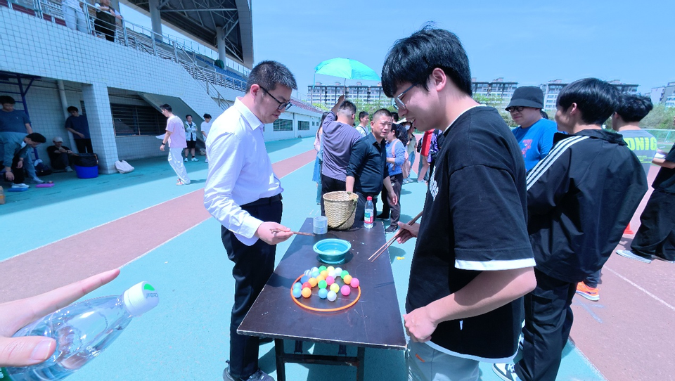 12时,活动在欢声笑语中拉开帷幕。运动会共设五项趣味项目,既有考验精准与耐心的“筷子捡球”“套圈”,也有强调团队协作的“摸石过河”“踩气球”,更有创意十足的“背负小球甩出”。各项目设计巧妙,规则简洁,既充满挑战性,又兼顾趣味性。在“摸石过河”环节,参赛师生需利用三块泡沫垫交替前进,稍有不慎便需从头开始,现场加油声与欢笑声交织;“踩气球”比赛中,选手们灵活穿梭,气球爆破声此起彼伏,将气氛推向高潮;“套圈”项目则展现了师生们的精准投掷技巧,矿泉水瓶与小玩具的“争夺战”引发阵阵喝彩。