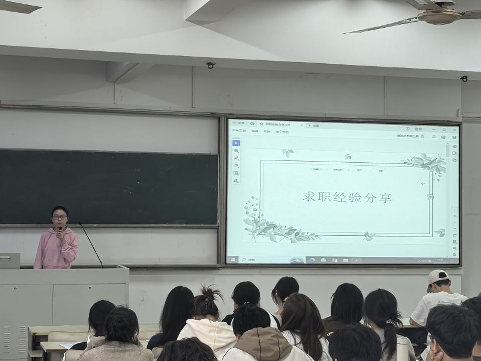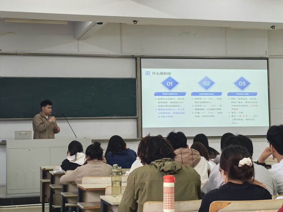 随后,研三包捷雨然学姐分享求职双通道攻略:考编需紧盯各地社招时间轴,暑期重点突破学科知识,校招阶段建议“广撒网”积累实战经验;企业求职则应锁定目标行业,精准打磨简历,把握线下宣讲会黄金机会。邹守达学长补充强调秋招重要性:“多投递、多演练、多总结”是斩获offer的三大法宝。