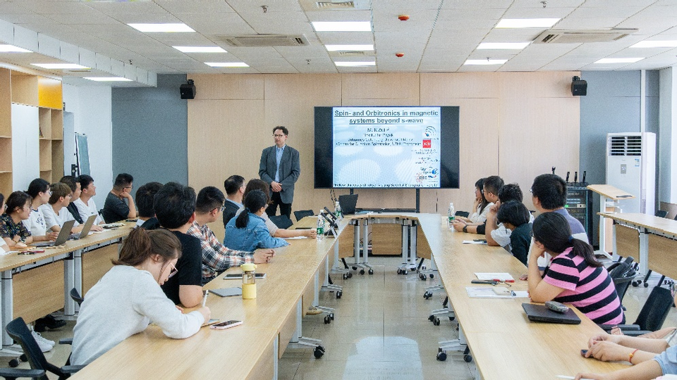 Mathias Kläui教授以 “Spin- and Orbitronics in magnetic systems going beyond s-wave”为题,为在场师生带来了一场高水平的学术盛宴。自旋轨道电子学是研究电子自旋与轨道角动量相互作用及其在磁性系统中应用的前沿学科。作为自旋轨道电子学领域的国际权威专家,在长达一小时的精彩报告中,Kläui教授系统介绍了该领域的最新研究进展,包括几何受限自旋结构的静态与动态特性、磁阻效应、自旋转移力矩以及自旋流诱导的磁化动力学等重要发现。特别值得关注的是,教授深入探讨了超越传统s波对称性的反铁磁、交错磁等磁性材料物理性质及其应用。