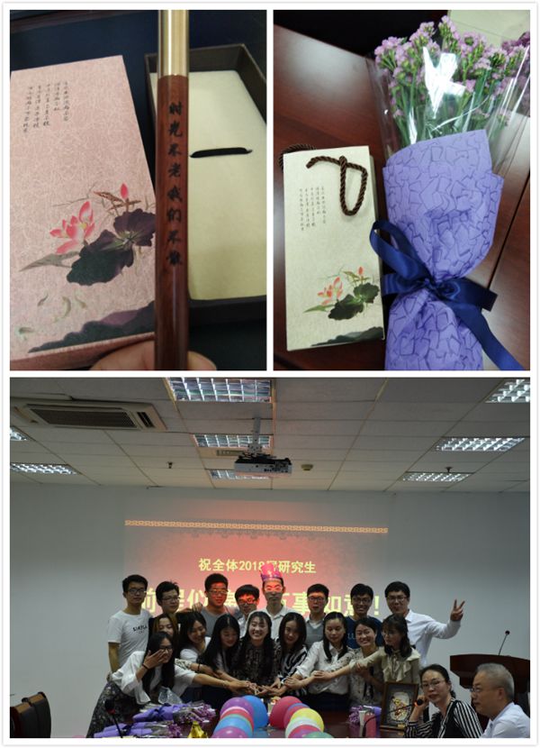 为感谢学院的精心培养,2018届毕业生向学院赠送了纪念品。研一奚亚丽同学代表在校生向毕业生赠送了纪念品并送上毕业的祝福。一支钢笔,赠予毕业生书写美丽人生,一束勿忘我,希望毕业生勿忘同窗情、师生情、南邮情!最后,副经理唐加山教授做最后一次课上点名并宣布下课!大家一起分享毕业蛋糕,庆祝顺利毕业!