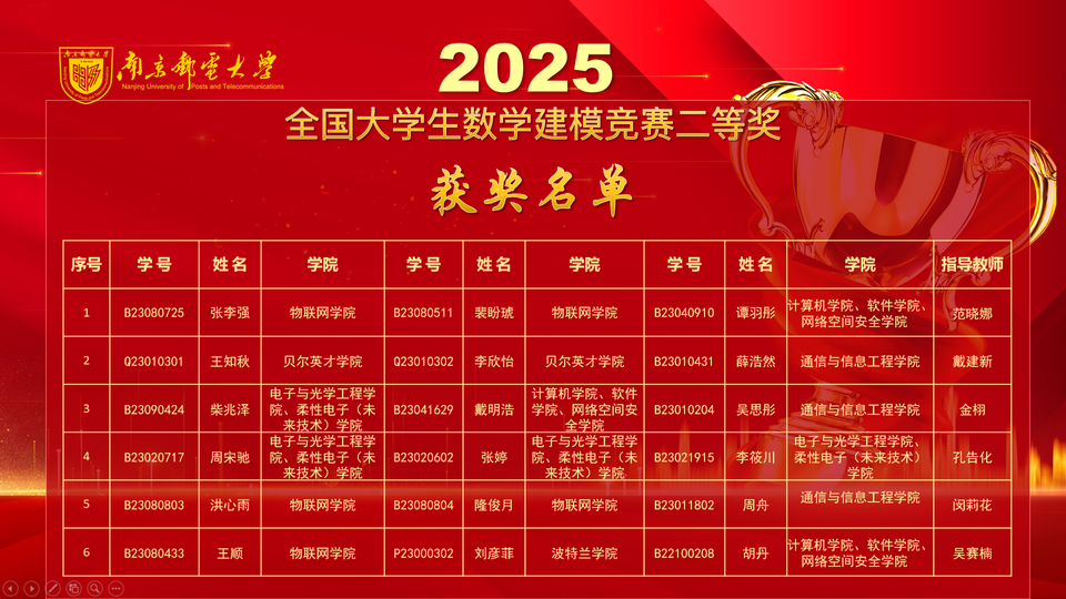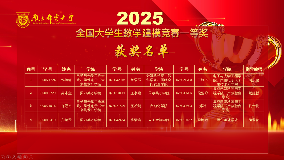 在2025年全国老员工数学建模竞赛中,获全国一等奖4项、二等奖6项,排名江苏高校第一、全国并列第四;获省级一等奖25项、二等奖20项、三等奖23项,持续保持全省领先地位,彰显学院在建模训练与人才培养方面的深厚积淀。
